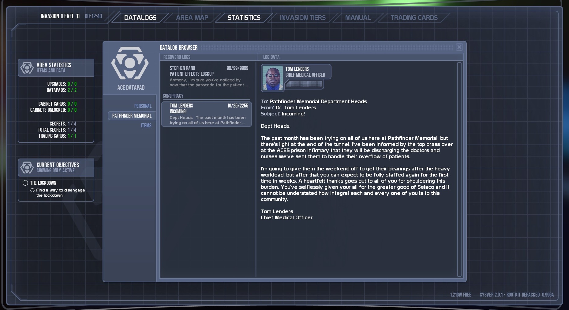 I didn’t read any of the many data-logs you can pick up in the demo, since it was clearly stated in the introduction that the story is disabled for the demo. But from the vibes I got from it, it felt a bit like Deus Ex, mixed with System Shock just 10 times the speed of gameplay. The UI design for checking information feels very RPG-like, which I think shows interesting promise for the future. I do wonder, though, if it will be wasted on a game like this? I could easily imagine a slower paced RPG with stealth in this engine, setting and visual style – alas, it is what it is, and it isn’t bad, it’s actually good, but it still had me longing when walking around the cool looking space station environments.