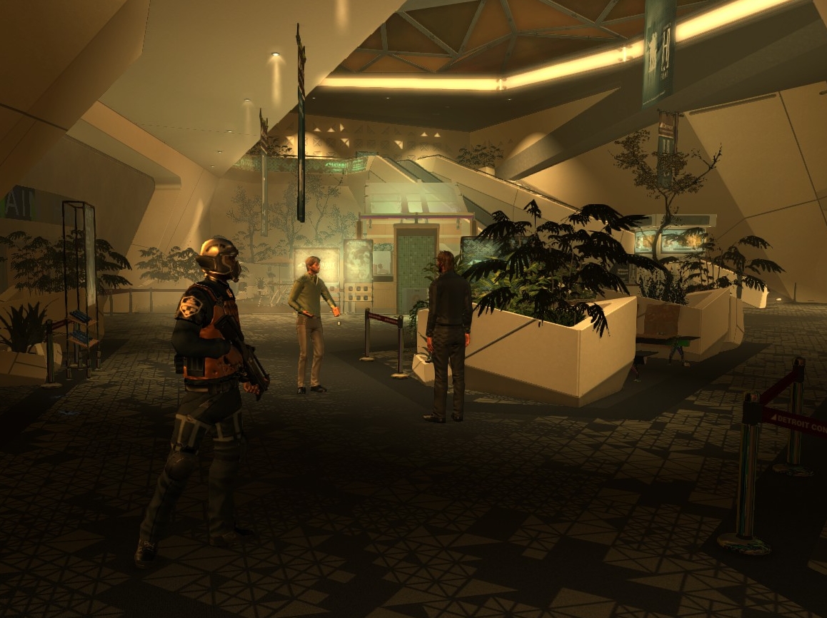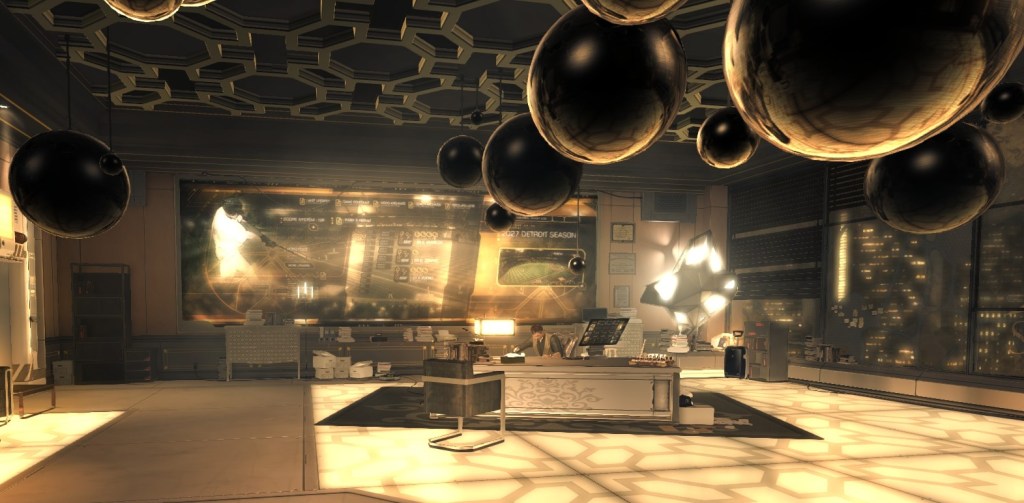 The visuals are great. I acknowledge it comes with some controversy, regarding the yellow/”piss” filter, but I think it fits the setting and adds a nice dreamlike shine to the experience. It also symbolizes the renaissance theme of the game, the ushering of a new golden age for mankind. Beyond that, the graphics look good, but what makes it all stand out is the competent futuristic design of… basically everything. There is a true visual splendor to Deus Ex: HR when it comes to the more extreme locations you will be visiting. I think the commonplace areas look interesting too. The mundane still looks mundane in this future setting, but it’s often interwoven with technology common to this world – to add a little strangeness and optical flair to it all. The all-embracing sleek design, in combination with the square-like stylistic form of clothing, makes for a really compelling visual style, and it never seems out of place and remains consistent throughout the whole game. It’s impressive work and highly adds to the experience. Now, graphics aren’t everything, but in the case here, it hangs more on the well-design style beyond the technical aspect of it. A truly good visual style lasts forever, while good graphics alone fade away eventually.
