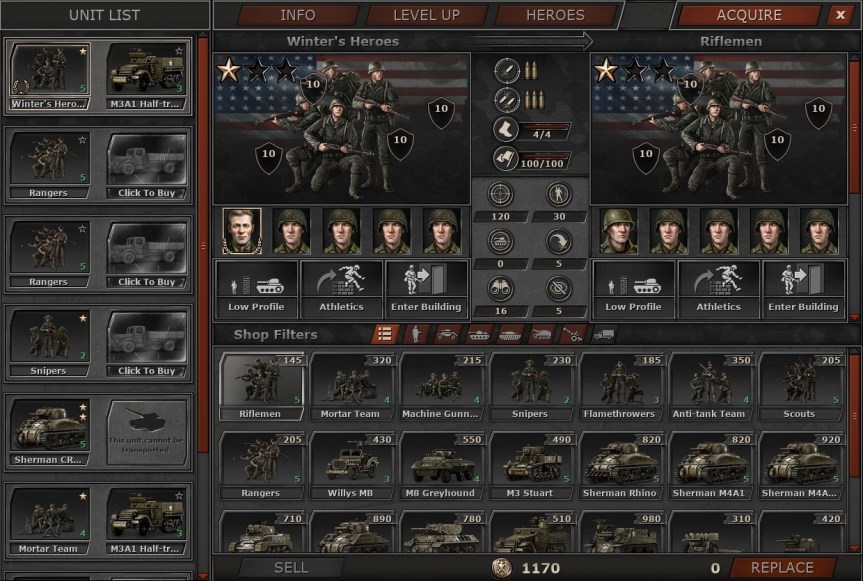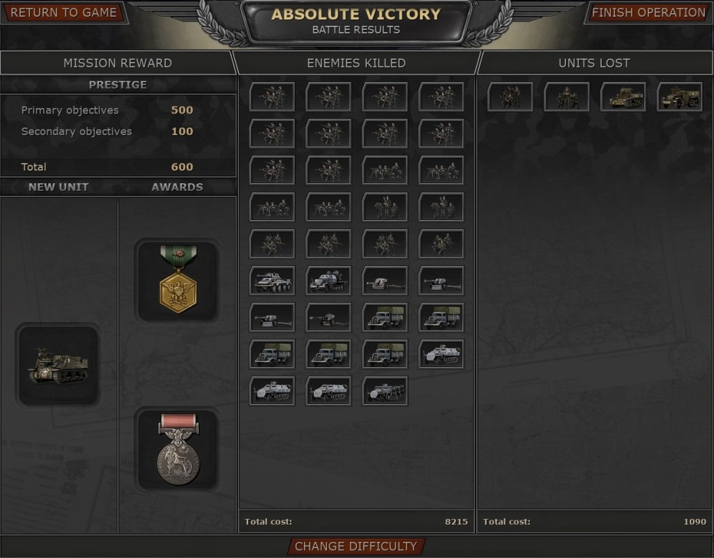 Tinkering and planning around your task force is very fun and reminds me a bit of X-com before heading out on a mission. It does not have the same level of detail, but there are a lot of things to consider before departing. Losing units doesn’t seem to be permanent, as they get replaced and they seem to keep their XP level. However, you do get punished on the general point system, which is used to buy and replace units. While you can change out the units for other types, there seems to be no way to go less or more than what you have. But for infantry units, you can use these points to provide wheels for your platoons if you so like in the form of half-tracks or trucks. Good if you want to create a fast mechanized force, or just want some extra firepower as the machine guns on top of the H3AI half-track can be deadly.