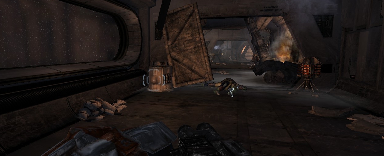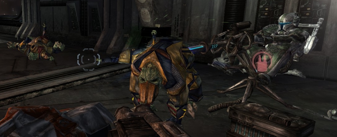 I wouldn’t say the visuals are that great, actually, they probably are on the ugly side. The textures are messy, most of the game is a bunch of corridors, and everything looks a bit oversized, but still, what they set out to do, they do. It does feel like Star Wars, notably the prequel aesthetics. Everything that is expected to be there, is there, and while it doesn’t look pretty in a general sense, it does have a few quirks that make it stand out still.