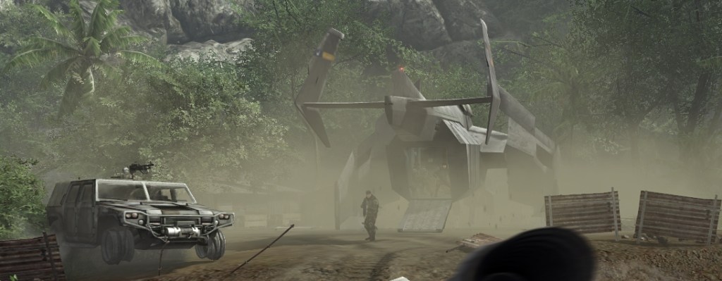 Not to forget the vehicles, which are a big part of the game as well. Most of the fighting will be on the ground, powered by your own two legs. But you will get the chance to drive and fly everything from jeeps and tanks to VTOL aircraft. Outside a few forced vehicle segments, the game lets you tackle the missions however you want. Sneak inside to whack dudes silently or go full guns blazing? Sure, pick whatever! Yet, you can also crash the party with a car with a mounted machine gun if you prefer. Crysis is not an open world, but the mission areas are big enough to allow you to play your way. I enjoy being the sneaky guy. To lie still in high grass, waiting for patrols to slowly wander past, and then slip away without them noticing me. Ah, professionalism!