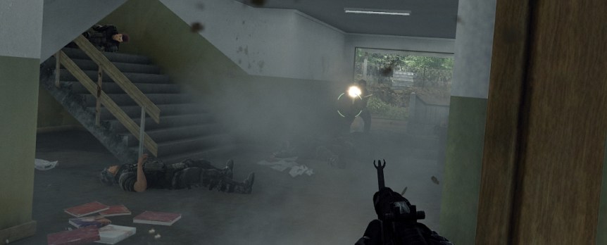 The fun all comes back to the AI, and boy is it an enjoyment to fight against. They will investigate suspicious noises, they will flank, lob grenades your way, and man stationary machine guns all day to keep your face down in the dirt. They will also lean dynamically from cover, just the same way you do it in-game. It’s very impressive to watch and engage with. One great part of the AI is that their alert status is not a permanent thing. They will never go back to being fully relaxed if they notice danger, but if you hide they will lose sight of you, having them search the area instead of being all-knowing of your location. This makes the sneaking and stalking extra thrilling. Luring North Koreans into deadly traps never gets old, especially if you have the good old trusty shotgun in your possession. However, they do come with one issue. On range, they have a hard time deciding what to do, unless they got a sniper rifle. Then they will blast your brain right out of your skull from over two kilometers away.