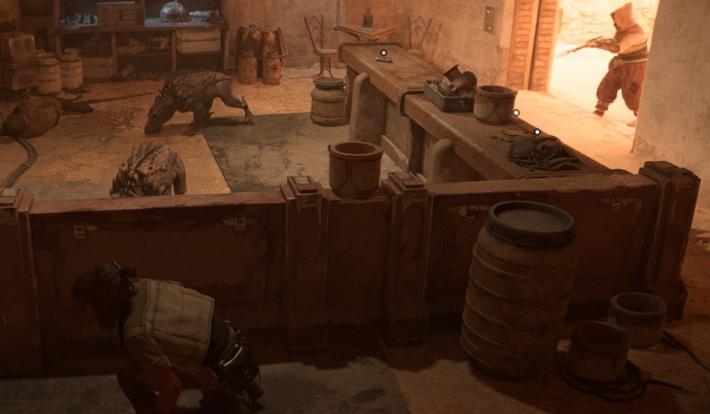 Even so, I think this system works well, considering who you are and what you are doing (sneakingly stealing stuff). You are not here to kill, even if certain missions always seem to turn out that way. But I can’t deny that only using your pistol for the majority of the game becomes pretty boring. Now, you can of course use other weapons, as mentioned. Yet, these only last for a moment. And if you are required to climb anything, or go through a vent, Kay will always drop the weapon. Overall, I found the third-person shooting action competently made, and enjoyable, particularly if you play on the higher setting, which makes blaster bolts actually hurt. It comes with a few issues, though. You can’t switch shoulders at will. Many times, Star Wars Outlaws will freak out when you step out of a cover, going back and forth over which shoulder to use. It’s incredibly annoying, since it slows down the game with you having to fight the mechanics to be able to see and shoot what you want. God forbid, you want to switch shoulder to peak around a corner; you will be denied every single time.