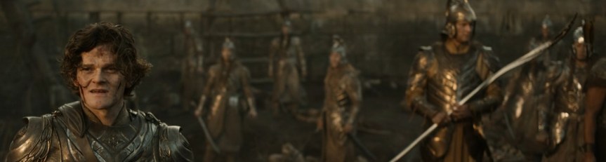 It’s so bad. When leaving the camp, Elron and his officer talk about their plans in the middle of all the orcs. They do it in elvish, but how can they be sure nobody knows that language? Anyway, the battle continues with Elron being sure that Durin with his dwarf army will show up to help (they don’t). Something Elron asked Durin earlier in the episode. Want to know how Elron uses his cavalry? It’s not by charging the enemy repeatedly to break them at least. We see them stand in place and fight orcs one to one, on horseback in a forest. This of course ends in a disaster and from here on out, the battle/siege is just a total mess. It’s hard to understand where the actual battle lines are, since units teleport from the near the wall, to the back of the lines, and so forth. It’s also overly retarded when it comes to the dramatic. Like when a female Asian (lol) elf gets shot by 10 arrows, with all the shots coming from different directions, yet still manages somehow to get off one last fire-arrow to blow up a catapult. Alrighty then.