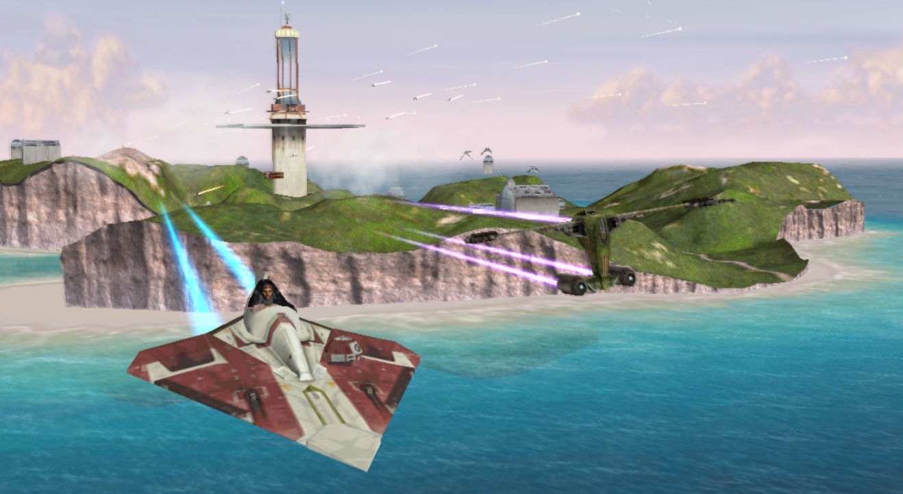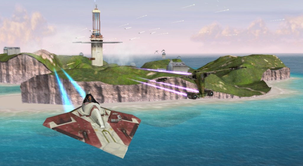 Gameplay is very similar to the first game, as you will be battling droids, and now Geonosians in the sky and on land, blasting everything from tanks to capital ships. What is cool is that the bigger ships now have targetable parts (like turrets) that you can destroy to limit their combat prowess. It’s not too involved, but it’s still a cool inclusion. In addition to that, the Jedi Adi Gallia that you get to control, come with her own force powers, with lightning being her most overpowered ability. Now you can blast and electrify whole squadrons of fighters if you time it right. I do feel this is a bit of a lore blunder, since I have never seen the Jedi, or anyone else, use force powers in this way from a fighter. If it was a common thing, we would have seen it getting used in the films. Nonetheless, it’s alright, and in combination with her force shield, it will make you very powerful and bail you out of sticky situations.
