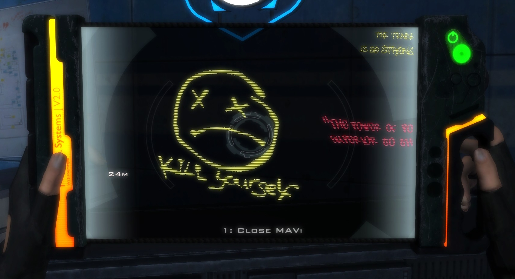 For being a relatively short low-budget game, there is a surprising amount of care that went into the background lore for the setting. There are tons of stuff to find and read, that even further expands on it. Being a sci-fi nerd myself that likes dystopian tales, this is right up my alley. The story, by itself, is much more straightforward. You get dragged into this disaster not exactly by choice, and have to force your way out by any means. At first, it’s just pure survival, but soon, you take the fight to the terrorists, especially when Kate realizes that the local security forces are getting demolished. Who’s to battle the suicide-cult if not Kate herself and her pal Scoot when everyone else is dead?