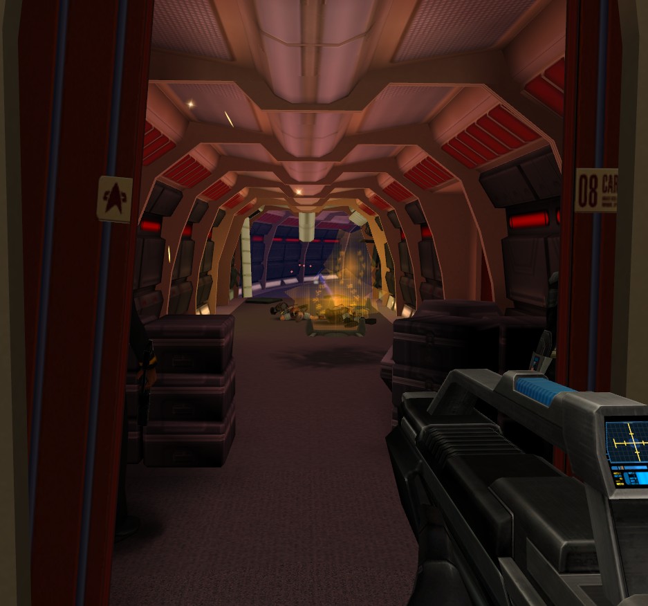 When talking about the visuals, it’s hard to believe Star Trek: Elite Force II is on the same engine (Quake III Arena engine) as its predecessor. The upgraded fidelity is out of this world, especially when it comes to the character and weapons models. It just looks so damn crisp! The environmental stuff looks amazing too. Those three years between the games sure did wonders for the engine tech-wise. It’s a very pleasant looking game overall, and besides a few issues, like when it’s portraying something vast far away, since it looks a bit flat, I think the graphics hold up incredibly well. And a couple of textures look even better than some modern titles today that hide everything behind a blurry filter. It was an impressive looking engine back then, that still now, many years later, can wow someone as jaded as me. Talk about a nice piece of software.