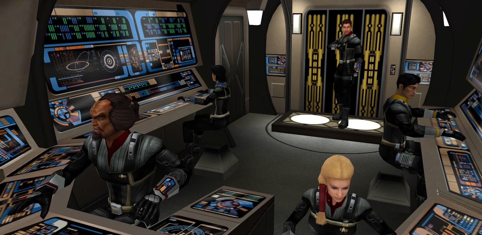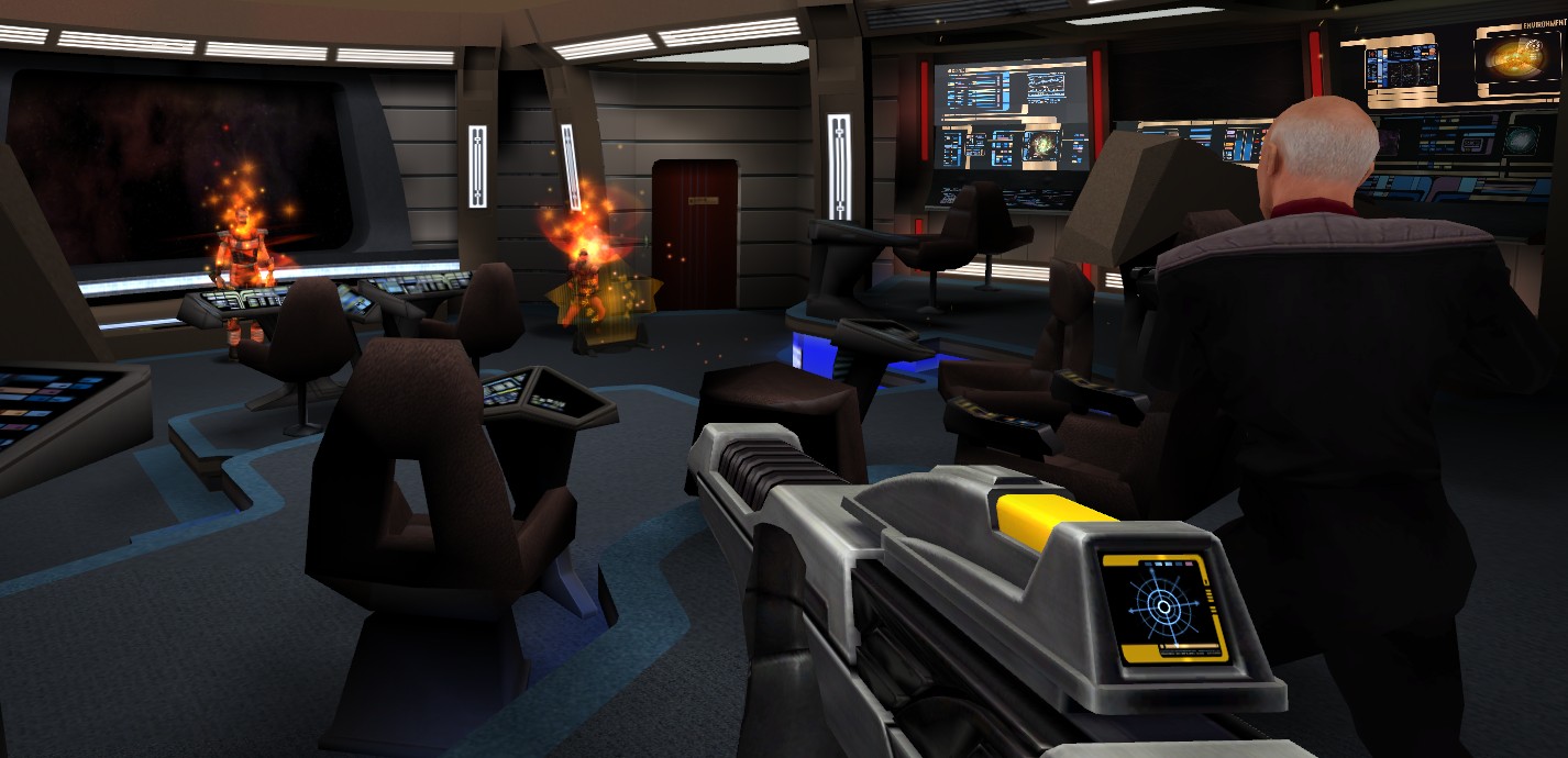 Two years pass, and Munro is stuck teaching combat to young recruits at the academy in San Francisco. One day, by pure chance, the one and only Captain Picard watches a holo demonstration of Munro’s combat technique when visiting the academy. Picard, not being a stranger to danger in the form of weird brain-eating aliens, and superheated phaser beams, sees the value of a so-called “Hazard Team”. Things end up favorable for Munro, with Picard letting him put together a team of veteran warriors. And about here the game starts for real. Right when you barely have been introduced to your new ship Enterprise, a fellow Federation vessel is in trouble, and wouldn’t you know it? The situation over at the Dallas is exactly what you are specialized in – namely blasting lifeforms to kingdom come.