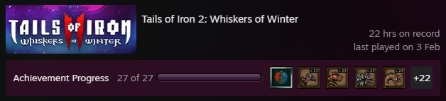 If you enjoy 2D-platformers, and Dark Souls -esque combat, this is certainly a buy. I highly recommend Tails of Iron 2: Whiskers of Winter. It’s challenging, but it isn’t too difficult if you take the time to learn the patterns of enemies and the mechanics of the game. And it does not overstay its welcome. The story gets wrapped up nicely, but it’s clear the developers left a few threads hanging. I’m expecting DLCs, or some sort of expansion in the future to continue the tail.