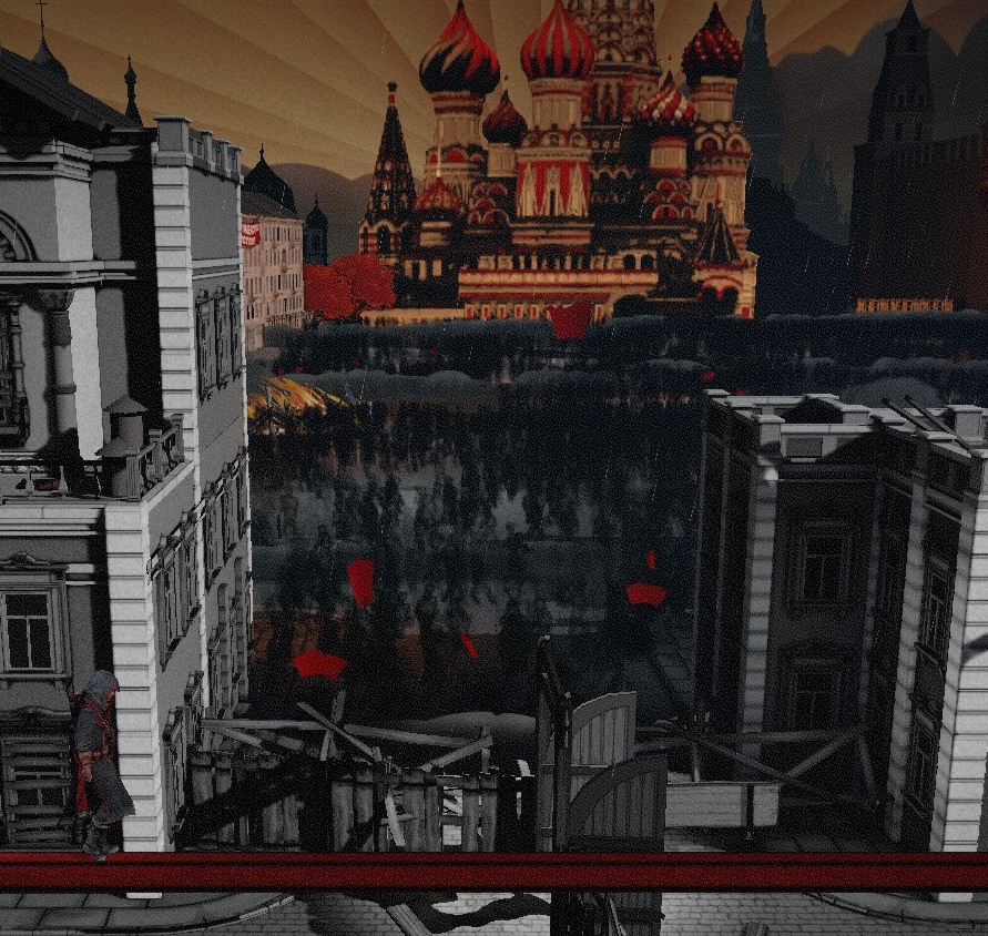 The style remains the same in a broad sense, except that the game is presented in a white and gray tone, to hammer home the chaos and despair of what is going on in the background. It looks great, with the red starkly standing out in the midst of all black and white. Very stylistic, that fits the setting like a glove. It reminds of the visual system of The Saboteur, which has a very similar style. In that game one of the few colors allowed is red, to show blood and the color of the Nazi flag. Only areas that you liberated gained color. It’s a bit on the nose, but the themes are the same, and works comparably. Well, except, that Assassin’s Creed Chronicles: Russia is only gray misery. Sounds, voice and music is also fine, and just like the previous games, it’s nothing that stands out, but works adequately for the setting.